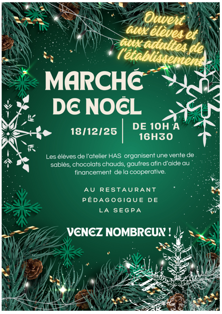Ce jeudi 18 décembre, de 10h à 16h30, se tiendra le Marché de Noël organisé par les élèves de l’Atelier HAS au Restaurant Pédagogique de la SEGPA.