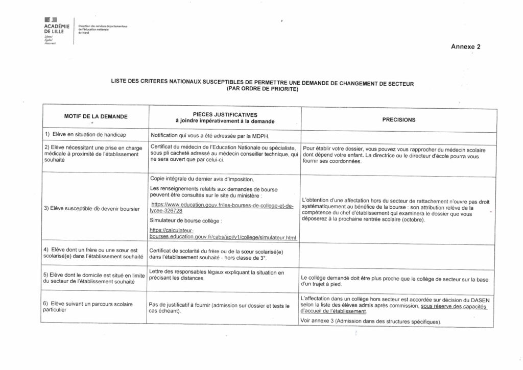 Il conviendra de renseigner la rubrique « DEMANDE DE SCOLARISATION DANS UN AUTRE COLLEGE PUBLIC DU DEPARTEMENT » en indiquant Collège du PÉVÈLE / Orchies, de préciser le motif de la demande de dérogation (selon l’un des 6 critères – voir document ci-dessous), de joindre les pièces justificatives et de signer le document.